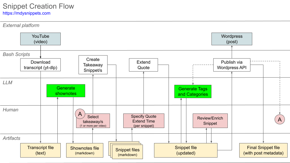 This diagram shows how AI-generated drafts flow through human review before they’re published as snippets on this site.
